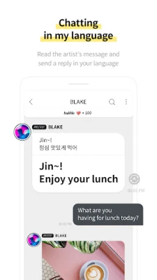 Váš idol netrpělivě očekává vaši odpověď. Vyjádřete svou podporu, lásku a povzbuzení ve zprávách, které si s nimi vyměňujete, a staňte se aktivní součástí jejich příběhu. Sledujte také speciální výročí a počítejte dny, které jste společně s vaším idolem strávili – každý den je jedinečný. Navíc nezáleží na tom, jakým jazykem mluvíte; bubble vám umožňuje číst zprávy idola a posílat odpovědi ve vašem rodném jazyce, což zajišťuje bezbariérovou komunikaci. Připojte se k bubble od Dear U a začněte psát svou vlastní kapitolu v příběhu s vaším idolem ještě dnes.